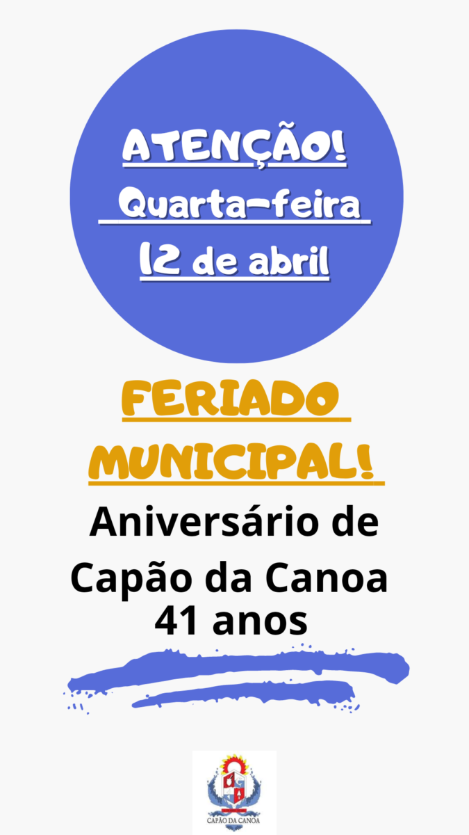 Na quarta-feira, 12 de abril, não haverá expediente no Legislativo Municipal, em razão do aniversário de 41 anos de emancipação político administrativa de Capão da Canoa, sendo "Feriado Municipal " em nossa cidade.
