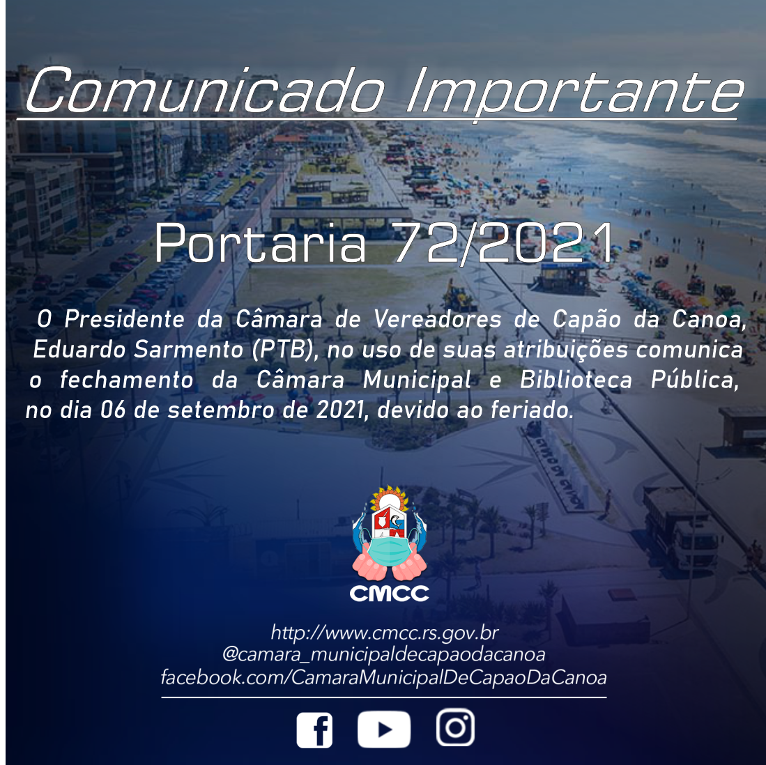 O Presidente da Câmara Municipal de Capão da Canoa, no uso de suas atribuições, comunica que a Câmara e Biblioteca Pública estará fechada no dio 06 de setembro, considerando o feriado de 07 de setembro, e sua compensação nos dias 02,03,08,09 e 10, com expediente das 08h às 14h, para os servidores do turno da manhã e para os servidores do turno da tarde das 13h às 19h.