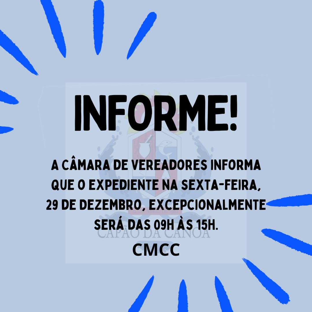 • Mudança no horário de expediente nesta sexta-feira na Câmara de Vereadores